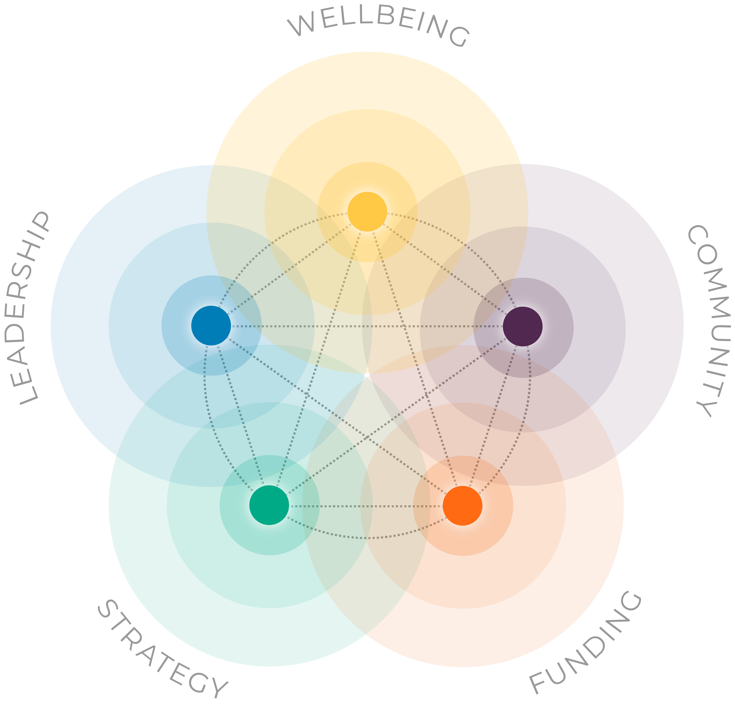 There are five fundamental keys to consciously building organizational culture: strategy, leadership, wellbeing, community, and funding. These keys work together. In other words, creating a culture that is fulfilling, conscious, and successful requires ongoing attention to all five areas.
